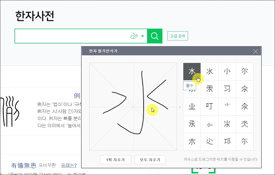 ▼웹서비스가 발전하면서 책으로 된 사전을 이용하는 사람이 많이 줄었습니다. 전자사전도 마찬가지고요. 왜냐하면 컴퓨터나 스마트폰으로 검색하는 것이 훨씬 간편하고, 많은 정보를 얻을 수 있기 때문입니다. 검색 방식도 많이 발전했습니다. 요즘에는 다음과 같이 마우스로 그리면 원하는 한자를 바로 찾을 수 있습니다. 쉽게 따라할 수 있도록 하나씩 순서대로 알려드리죠.