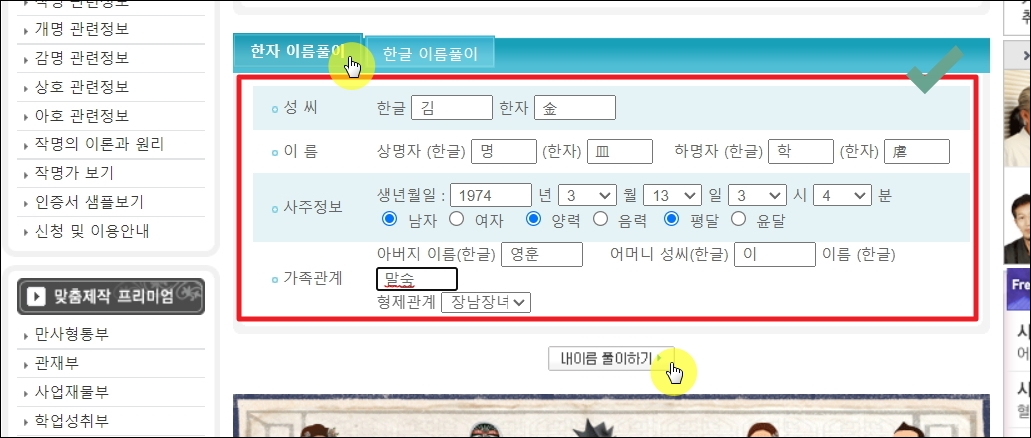 ▼사주닷컴의 한자 이름풀이 서비스를 이용해 보겠습니다. 몇 가지 정보를 입력해야 합니다. 일단 자신의 성명을 한자까지 모두 입력합니다. 그 다음 사주 정보에 속하는 생년월일, 태어난 시각, 성별 등을 정확하게 기재합니다. 추가로 가족관계에 대한 내용을 입력하면 됩니다. 모두 입력했으면 [내 이름 풀이하기] 버튼을 누릅니다.