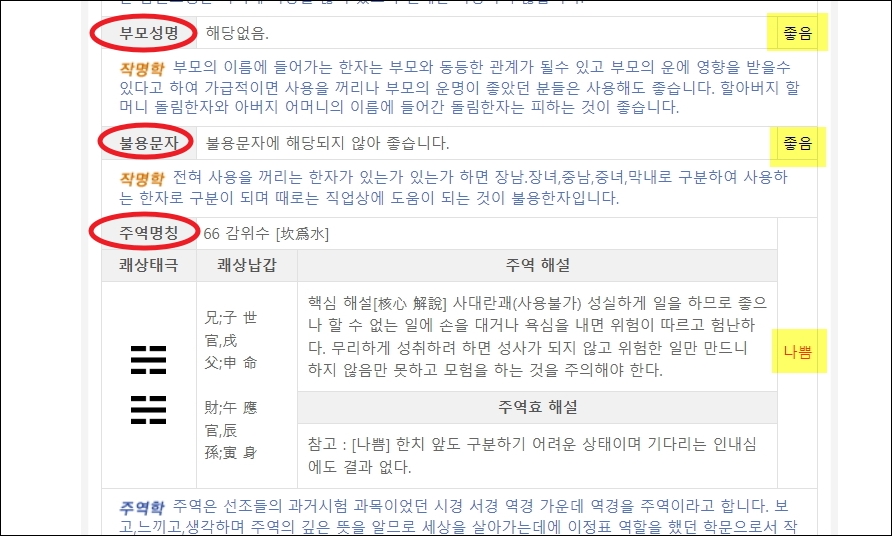 ▼사람에 이름에는 사용하면 안되는 한자가 있습니다. 처음 이름을 지을 때 이러한 부분을 감안하여 지어야 하는데요. 사주닷컴의 이름풀이 서비스를 이용하면 간단히 불용한자를 사용했는지 여부를 확인할 수 있습니다. 성명학에 속하는 부모 성명과의 조화에 대한 내용도 확인이 가능합니다. 주역학을 기반으로 풀이한 결과도 있으니 참고하시길 바랍니다.