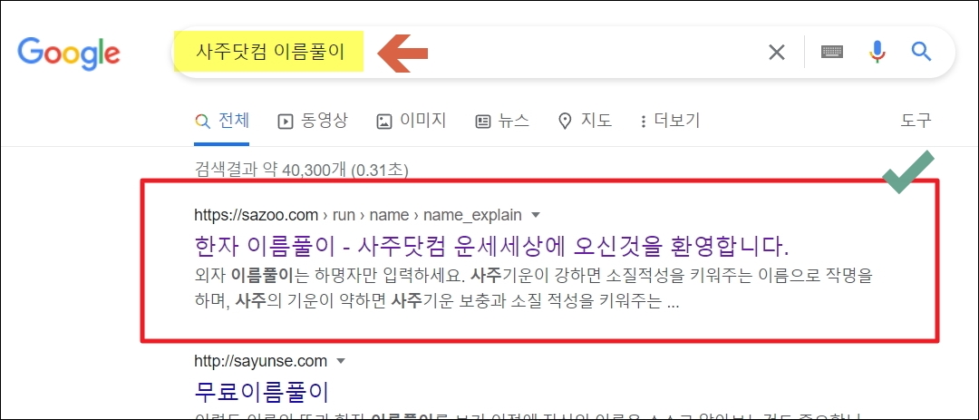 ▼성명학 획수풀이는 물론이고, 사주 등을 볼 수 있는 사이트가 있습니다. 바로 사주닷컴입니다. 이곳에서 제공하는 이름풀이 서비스를 이용하면 불용한자, 사주에 끼치는 이름의 영향력, 자원오행, 81수리 등을 볼 수 있습니다. 사이트에 접속할 때에는 "사주닷컴 이름풀이"로 검색하면 메뉴 선택 없이 바로 해당 서비스 페이지로 접속이 가능합니다.
