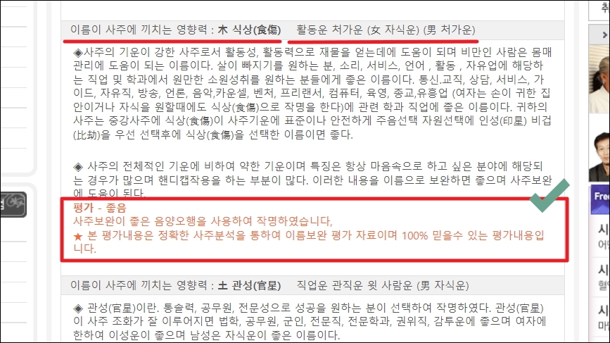 ▼가장 먼저 이름이 사주에 끼치는 영향력에 대해 알려줍니다. 활동운, 처가운, 직업운, 관직운 등을 알아볼 수 있죠. 자세히 읽을 시간이 없는 분들은 평가 부분만 보면 됩니다. 좋은지 나쁜지 바로 확인이 가능합니다.