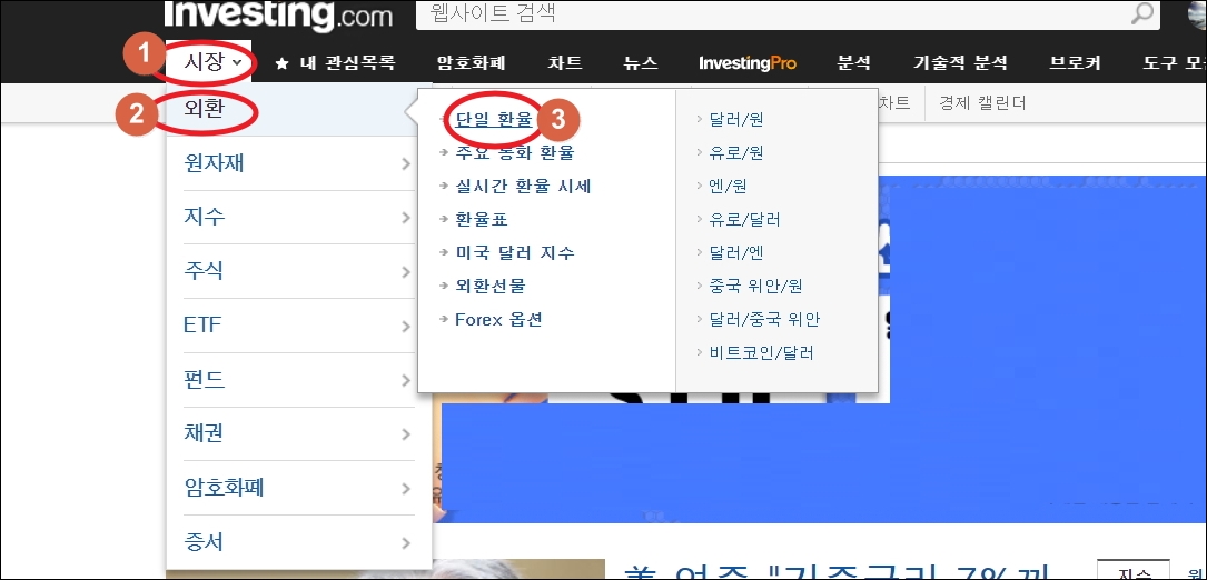 ▼인베스팅 홈페이지에 접속했습니다. 여러 메뉴 중에서 좌측에 있는 [시장]을 선택합니다. 그럼 외환, 원자재, 지수, 주식 등 여러 상품이 나타납니다. 이 중에서 [외환]을 선택한 후 [단일 환율]이나 [주요 통화 환율]을 선택합니다.
