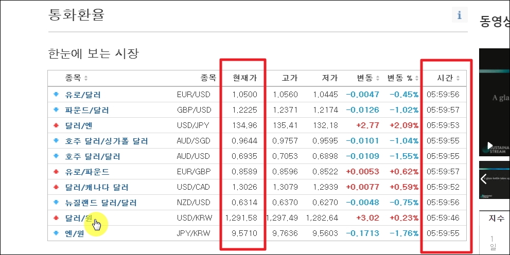 ▼주요 통화 환율 페이지가 열렸습니다. 기축통화인 달러를 중심으로 유로, 파운드, 엔화, 원화 등 다양한 통화에 대한 환율 시세를 볼 수 있습니다. 표에서 보면 시간이 있는데, 시세 정보가 업데이트 되는 시간을 의미합니다. 1초 단위로 업데이트 되기 때문에 거의 실시간으로 확인할 수 있다고 보면 됩니다.