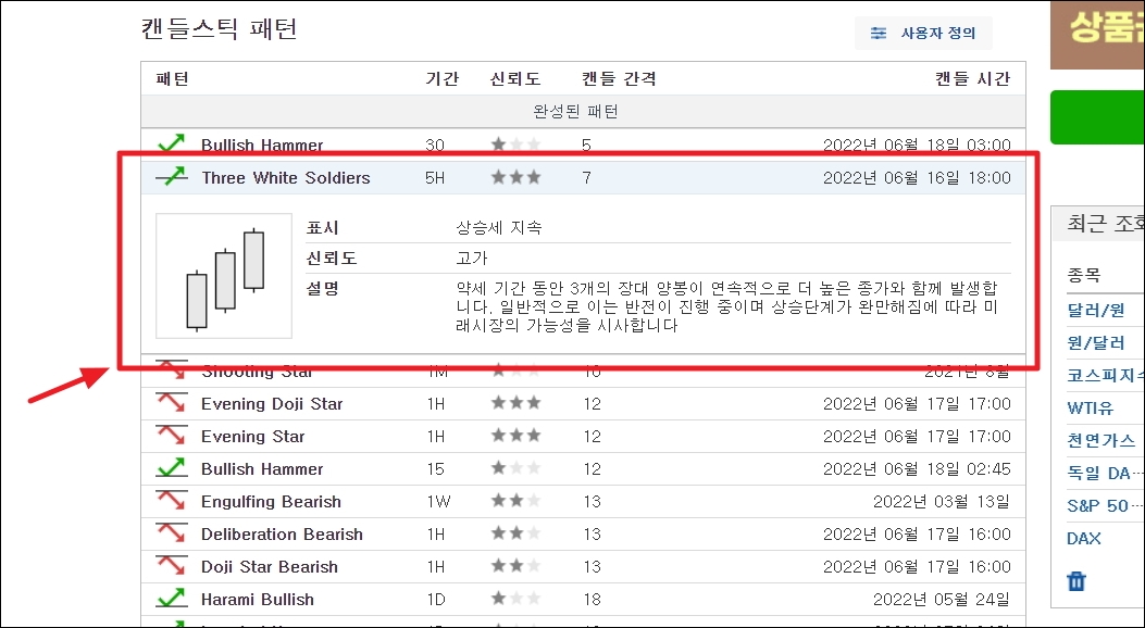 ▼캔들스틱 분석 결과에 대한 설명도 확인이 가능합니다. 신뢰도 표시가 되기 때문에 높은 신뢰도를 보이는 것 위주로 참고하는 것이 좋습니다. 설명을 통해 해당 캔들 모양이 나오면 다음 시세가 어느 방향으로 흐르는지 알 수 있습니다. 물론 실제로 그렇게 되는지는 아무도 알 수 없습니다.