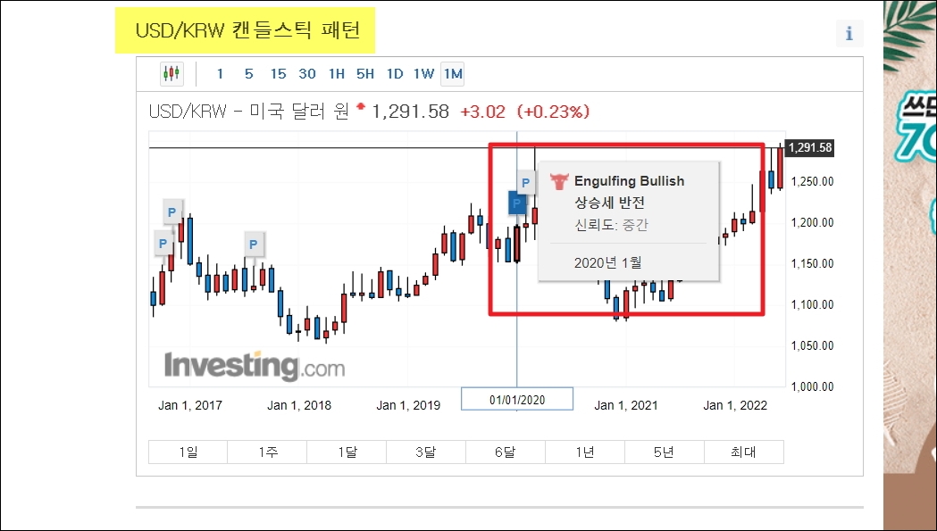 ▼저는 미래 달러시세를 예측할 때 그래프에서 월봉을 보거나 인베스팅의 캔들스틱 패턴 자료를 참고합니다. 원달러 그래프를 분석한 결과를 살펴보았는데, 50% 이상은 맞는 것 같습니다. 최근에 유독 맞지 않는 경향이 있는데, 이러한 패턴을 많은 사람들이 알고 있다 보니 캔들 분석이 통하지 않는 것 같습니다. 그래도 참고하기에는 좋은 도구입니다.
