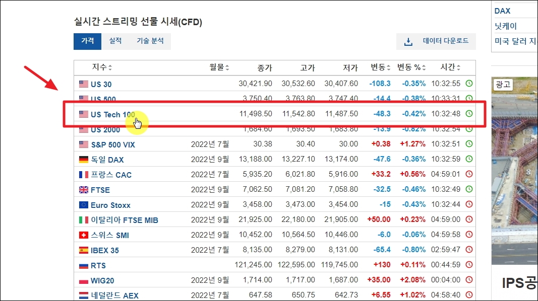 ▼저는 나스닥 선물 지수를 선택했습니다. "실시간 데이터"라는 문구를 통해 알 수 있듯이 인베스팅 사이트를 통해 얻는 미국 선물 지수에 대한 정보는 실시간으로 업데이트가 됩니다. 현재 미국증시에 대한 현황을 제대로 알고 싶을 때 이용하기에 적합한 지표에요. 여기에 더하여 차트, 뉴스, 분석, 포럼 등의 서비스도 제공합니다. 이 중에서 몇 가지 쓸만한 것을 알려드리겠습니다.