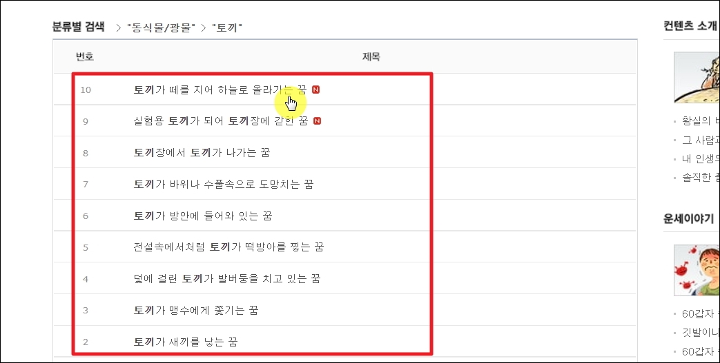 ▼저는 토끼 관련된 꿈을 찾아보았습니다. 여러 가지 해몽 자료가 나오는데요. 여기에서 본인이 꾼 꿈과 가장 유사한 것을 선택합니다.