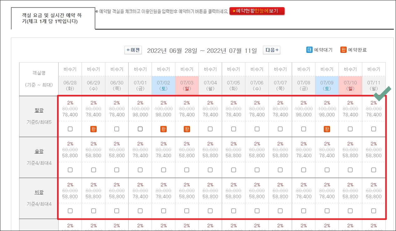 ▼다음으로는 객실 요금 및 실시간 예약표가 나타납니다. 펜션 자바 사이트를 이용하면 다음과 같이 객실 현황을 실시간으로 확인할 수 있습니다. 여기에 더하여 할인된 가격으로 이용할 수 있죠.