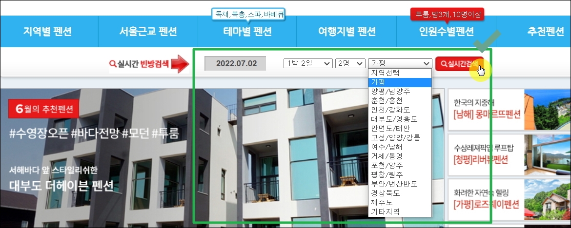 ▼펜션자바 사이트에 접속했습니다. 이곳에서는 실시간 검색 기능을 제공하고 있습니다. 실시간으로 지금 비어있는 객실을 찾아보고, 마음에 드는 곳을 바로 예약할 수 있어요. 실시간 빈방검색을 위해 날짜, 숙박일, 숙박 인원, 여행 지역을 선택해 주세요.