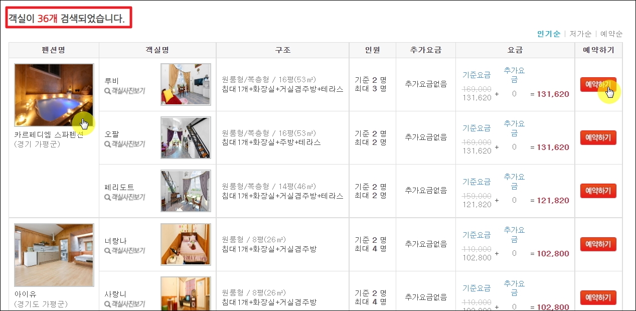 ▼저는 요즘 많은 사람들이 찾는 가평 지역을 선택했습니다. 여러 개의 페션에서 36개 객실을 예약할 수 있다고 나왔는데요. 간단한 객실 사진과 구조, 요금을 통해 여러 객실을 비교할 수 있도록 되어 있습니다. [예약] 버튼을 누르면 기준 요금보다 저렴하게 예약을 진행할 수 있습니다.