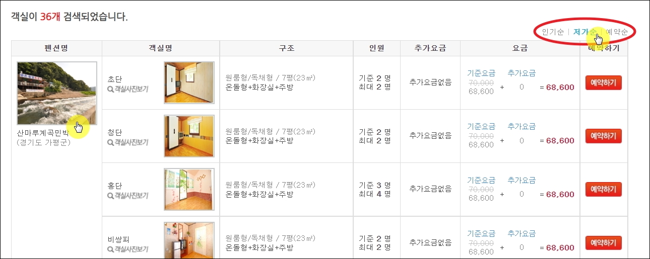 ▼객실 리스트는 인기순, 저가순, 예약순으로 정렬이 가능합니다. 해당 사이트에서 찾아볼 수 있는 가평 펜션 중 가장 저렴한 곳은 68,600원에 이용이 가능하네요. 좌측에 있는 펜션 사진을 선택해 보세요. 그럼 좀 더 상세한 정보를 얻을 수 있습니다.