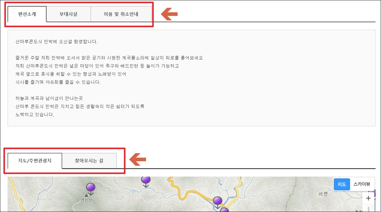 ▼마지막으로 펜션에 대한 소개글, 부대 시설, 이용 및 취소 안내글을 읽어볼 수 있습니다. 추가적으로 지도, 주변 관광지, 찾아오시는 길에 대한 정보도 있으니 참고하시길 바랍니다.