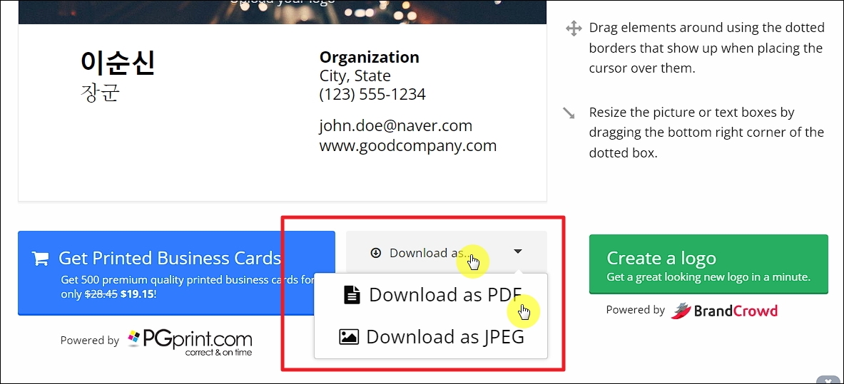 ▼우리가 만든 명함제작 완성본을 이미지 파일로 다운 받는 것이 가능합니다. 미리보기 화면 아래에 있는 다운로드 버튼을 누르면 PDF 또는 jpg 파일로 컴퓨터에 저장하는 것이 가능합니다.