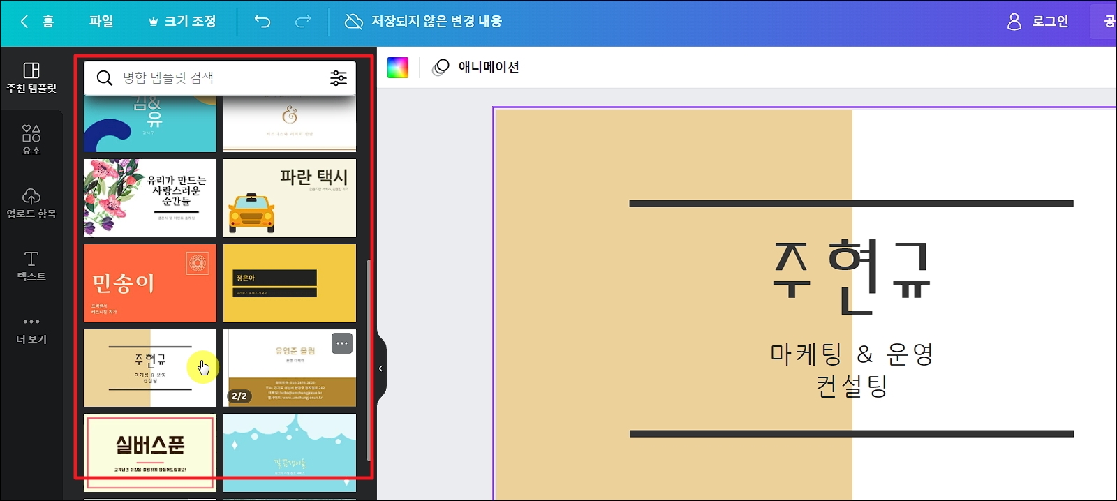 ▼새롭게 열린 페이지는 여러 가지 디자인 작업을 할 수 있는 프로그램으로 되어 있습니다. 좌측에는 명함 제작에 사용되는 템플릿이 여러 개 나타납니다. 여기에서 마음에 드는 디자인을 선택해주세요. 그럼 바로 우측에 있는 편집화면에 해당 템플릿이 구현됩니다. 이를 본인에게 맞게 수정 및 제작을 하면 됩니다.