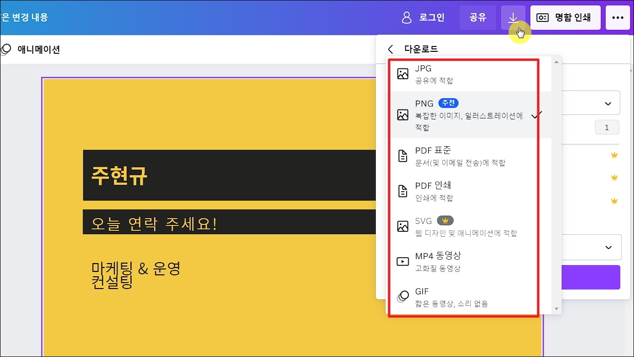 ▼디자인을 꾸미고, 내용을 본인에 맞게 편집 및 수정을 한 후에는 해당 디자인을 이미지 파일로 다운로드 받아보세요. 우측에 있는 다운로드 아이콘을 선택하면 다양한 파일로 컴퓨터에 저장이 가능합니다. jpg, png, PDF, svg 등 다양한 이미지 파일 포맷을 사용할 수 있습니다.