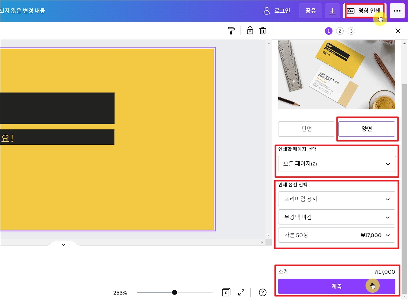 ▼직접 인쇄를 하거나 인쇄 업체에 인쇄를 의뢰하는 경우가 아니라면 해당 사이트에서 제공하는 명함 인쇄 서비스를 이용하는 것도 좋습니다. 사이트 화면에서 우측 상단에 있는 [명함 인쇄] 버튼을 클릭하면 해당 서비스 이용이 가능합니다. 양면으로 인쇄하는 것이 가능하고, 프리미엄 용지나 무광택 마감 등의 옵션을 적용할 수 있습니다. 조건 선택에 따라 즉시 반영이 되는 가격이 명확하게 표시 되어 있으니 참고하여 진행하면 됩니다.
