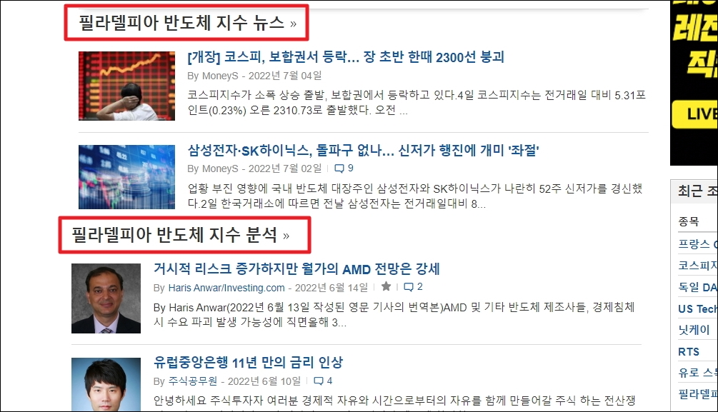 ▼기술적 분석과 함께 보기 좋은 것은 기본적 분석에 속하는 뉴스와 분석 자료입니다. 이것도 인베스팅 사이트에서 무상으로 제공하고 있으니 필라델피아 반도체지수에 대한 분위기를 알아 볼 때 사용하면 좋습니다.