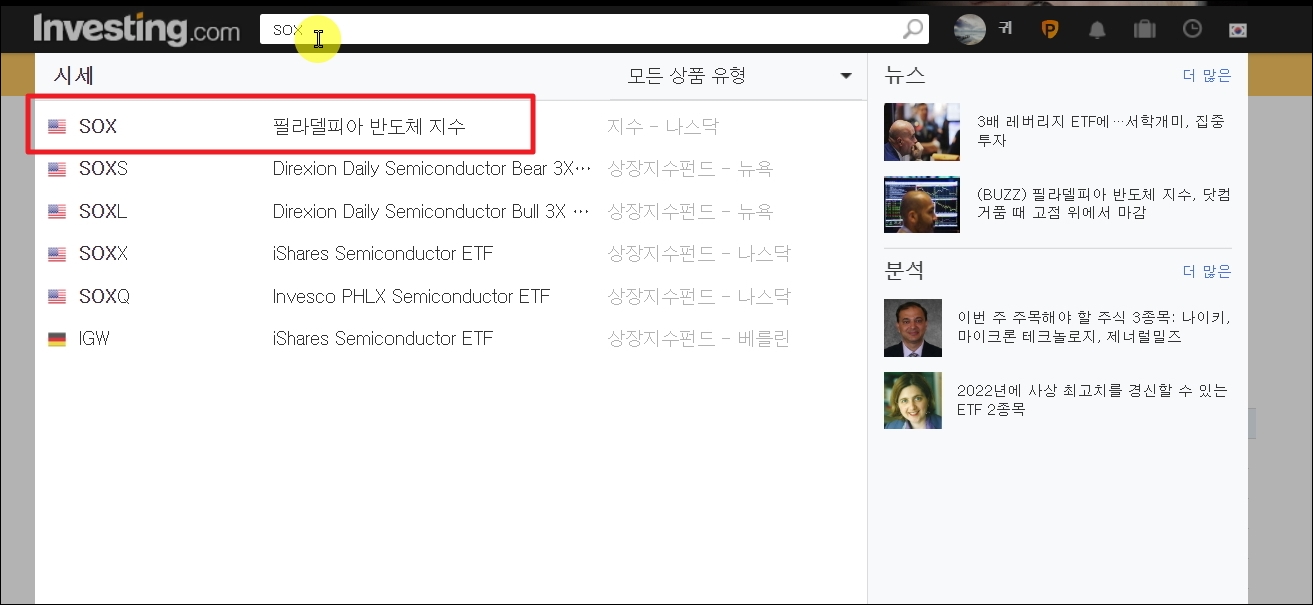 ▼인베스팅 홈페이지에 접속하면 여러 메뉴가 나타납니다. 이번 시간에는 메뉴 선택을 하지 않고, 바로 검색창에 필라델피아 반도체 지수에 대한 키워드를 입력하여 실시간 시세 파악을 해 보도록 하겠습니다. 검색창에 "sox"를 입력한 후 엔터키를 눌러 보세요.