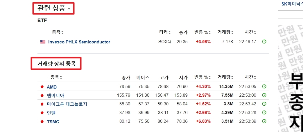 해당 지수에 속한 개별종목에 투자하는 방법도 있는데요. SOX 페이지에서는 AMD, 엔디비아, 마이크론 테크놀로지, 인텔, TSMC emd 여러 종목에 대해 알아볼 수 있습니다.