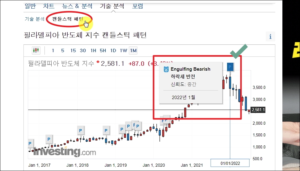 ▼제가 앞으로의 필라델피아 반도체 지수를 예측하는 방법을 하나 알려 드리겠습니다. 여러 방법이 있지만, 그 중에서 기술적 분석을 할 때 쓰이는 것이 캔들스틱 패턴 도구입니다. 인베스팅에서 제공하는 해당 서비스를 이용하면 캔들 모양을 가지고 자동으로 분석하여 앞으로 어떤 방향으로 흐를지 예측하는데 도움을 줍니다. 물론 무조건 맞는 것은 아니기 때문에 적당한 선에서 참고하는 것이 좋습니다.
