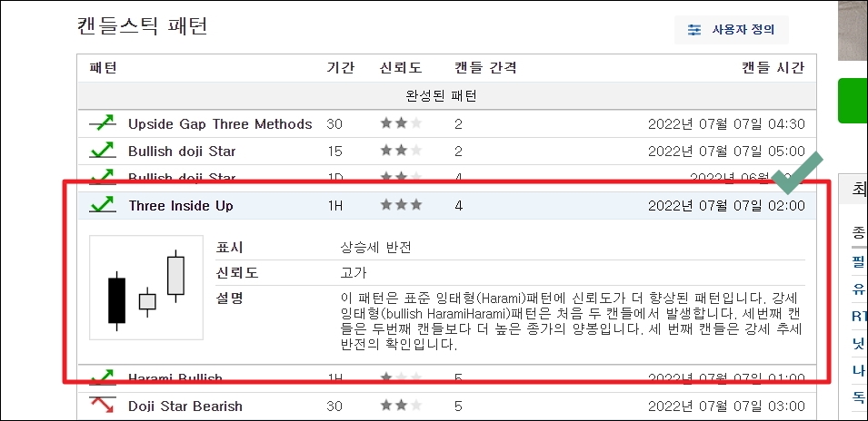 ▼캔들스틱 패턴은 단순히 방향만 알려 주지 않습니다. 신뢰도와 상세한 설명도 함께 제공하고 있습니다. 그렇기 때문에 초보자도 쉽게 이해가 가능합니다.