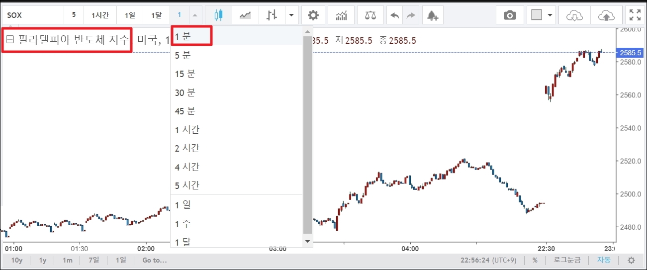 ▼다음과 같이 차트를 통해서도 필라델피아 반도체 지수를 실시간으로 확인이 가능합니다. 1분봉으로 보면 더욱 더 실시간 확인이 가능한데요. 주식 시장이 열린 상태에서는 해당 그래프가 실시간으로 그려지는 것을 확인할 수 있습니다.