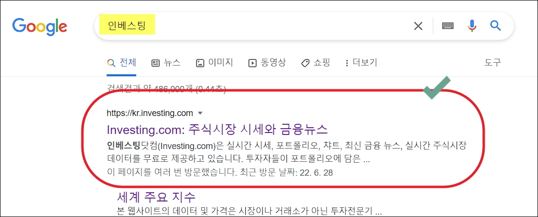 ▼인베스팅 홈페이지에 접속하면 여러 메뉴가 나타납니다. 이번 시간에는 메뉴 선택을 하지 않고, 바로 검색창에 필라델피아 반도체 지수에 대한 키워드를 입력하여 실시간 시세 파악을 해 보도록 하겠습니다. 검색창에 "sox"를 입력한 후 엔터키를 눌러 보세요.