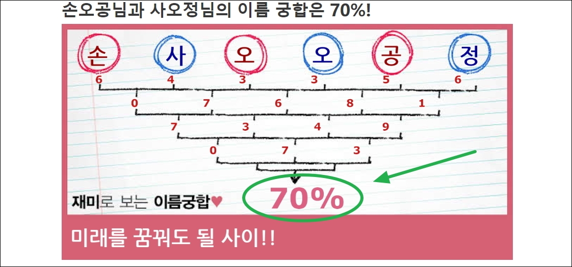 ▼다음은 첫 번째 테스트를 이용한 결과입니다. 장난스럽게 서유기에 나오는 손오공과 사오정의 이름 궁합을 맞추어 보았습니다. 사람이 직접 획수를 세어 계산해도 되지만, 프로그램을 이용하면 두 사람의 성명만 입력해도 바로 결과가 나옵니다. 궁합이 70%로 미래를 꿈꿔도 될 사이라고 하네요.