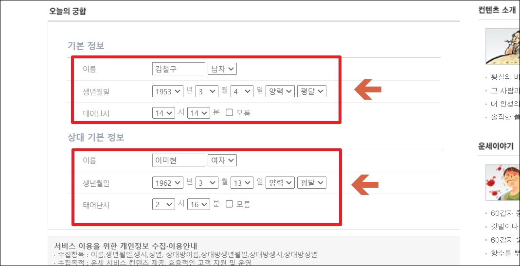 ▼네이트 검색 오늘의 궁합 테스트를 이용하려면 이름뿐만 아니라 생년월일과 태어난 시각까지 입력해야 합니다. 정확하게 입력해야 제대로 된 결과를 만나볼 수 있으니 참고해 주세요.