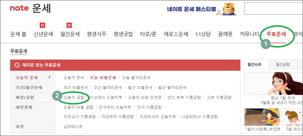 ▼네이트 운세 사이트에에서 [무료 운세] 메뉴를 클릭합니다. 그럼 우리가 이번 시간에 이용할 테스트를 찾을 수 있습니다. 여기서 우리는 "오늘의 궁합" 서비스를 이용해 볼 겁니다. 매일마다 두 사람의 관계에 대해 알아볼 수 있어요.
