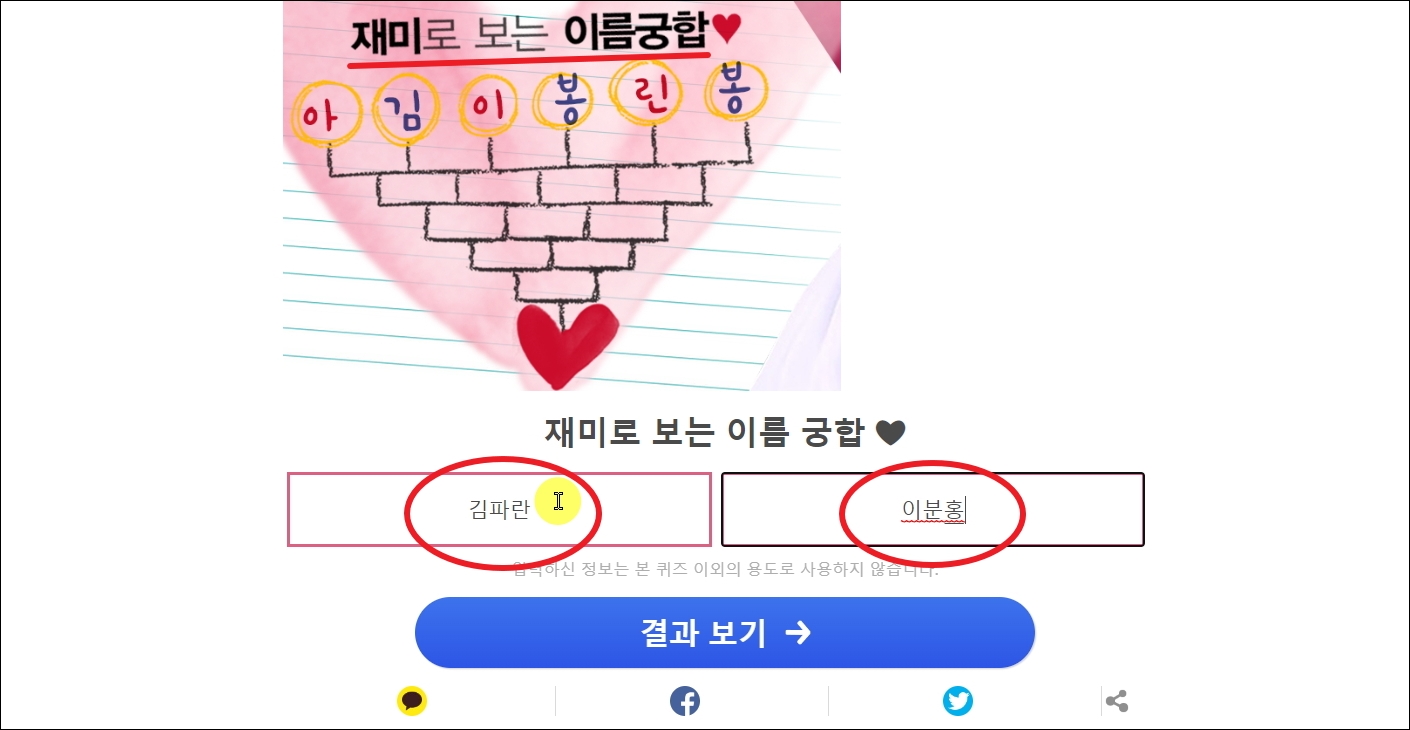 ▼위와 같은 간단한 이름 궁합 테스트는 봉봉 사이트에서 무료로 이용이 가능합니다. "봉봉 이름 궁합"으로 검색하여 접속하면 해당 서비스 페이지로 바로 이용할 수 있어요.