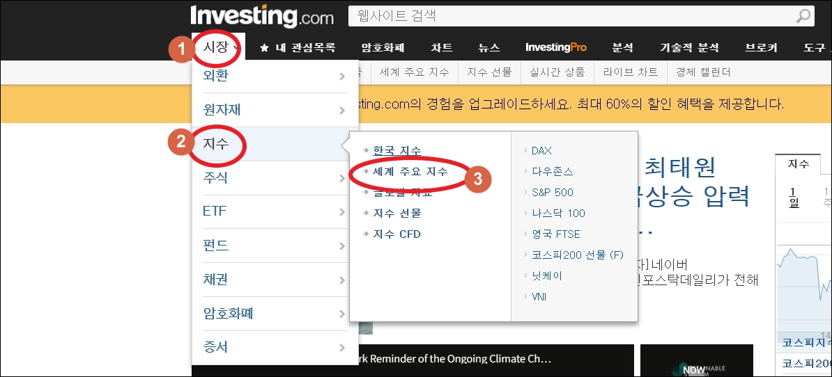 ▼인베스팅 사이트에 접속하면 메뉴에서 시작을 클릭해 보세요. 그럼 여러 가지 상품이 나타납니다. 중국 주가지수를 알아 보고 싶다면 [지수]를 선택하고, 중국 주식 시장에서 거래되는 개별주식에 대해 알아 보고 싶다면 [주식] 메뉴를 선택해 주세요. 이번 시간에는 [세계 주요 지수]를 선택하여 중국 정보에 접근해 보겠습니다.