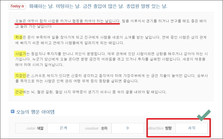 ▼하루 단위의 운세에 대한 풀이임에도 불구하고, 다른 역술 사이트와는 다르게 상세한 해석을 만나볼 수 있습니다. 여기에 더하여 오늘의 운세 방향, 숫자, 색깔도 알아볼 수 있죠. 현재 직업에 따라 다른 해석을 보여주는 것도 인상적입니다.