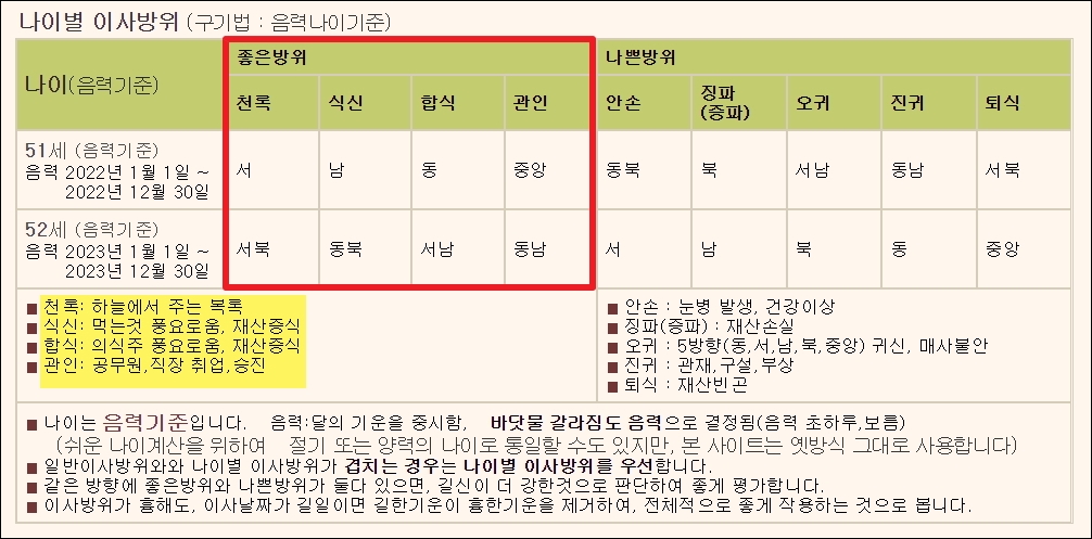 ▼풀이 결과가 나왔습니다. 나이별 이사방위를 보면 본인의 나이에 따라 이사하면 좋은 방위 4가지와 피해야 하는 나쁜 방위 5개를 알 수 있습니다. 천록, 식신, 합식, 관인에 관련된 방위는 풍요로움, 승진, 재산증식 등 좋은 일이 생긴다고 하네요.