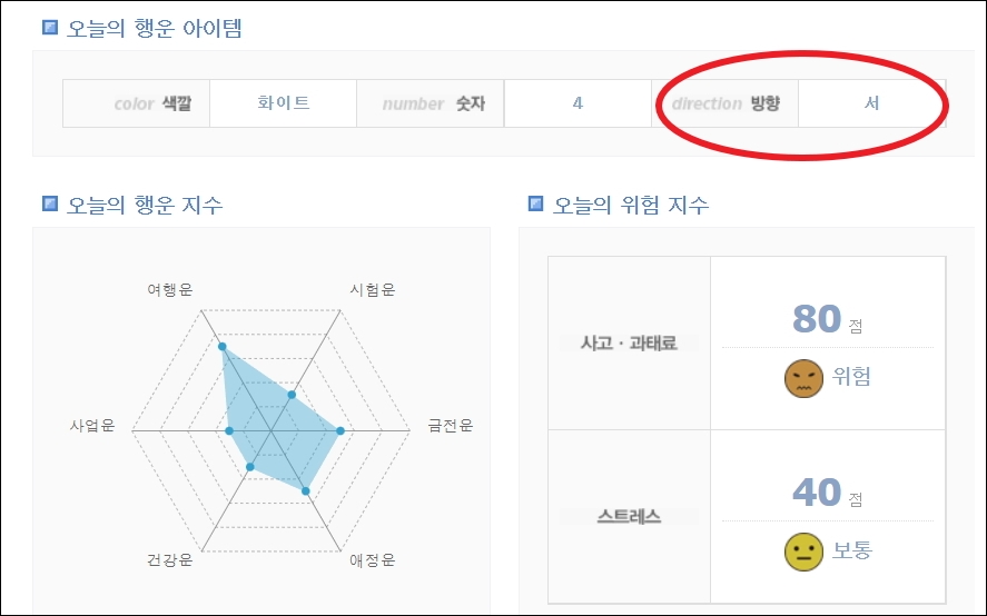 ▼요즘 운세 서비스가 많이 발전했습니다. 단순하게 풀이만 구구절절 나오던 방식을 넘어섰어요. 사용자가 빠르고 쉽게 이해할 수 있도록 다음처럼 표와 그래프, 이모티콘을 이용하는 곳도 있죠. 오늘의 행운 아이템 목록을 보면 서쪽 방향이 표시되어 있습니다. 이런 식으로 나에게 행운을 가져다 주는 방향을 확인할 수 있습니다.