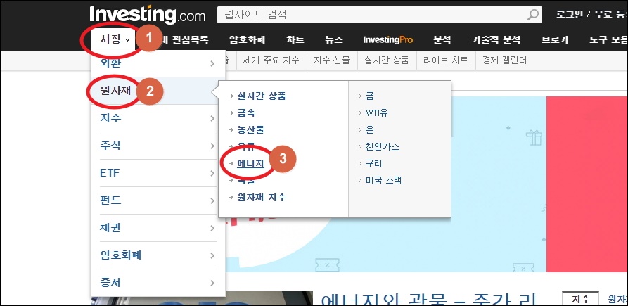 ▼인베스팅 사이트에 접속했습니다. 이곳에서는 외환, 원자재, 지수, 주식, ETF 등 다양한 투자 상품에 관한 정보를 얻을 수 있습니다. 거의 모든 상품에 대한 시세를 실시간으로 알려주죠. 그럼 국제유가에 대한 정보를 얻기 위해 메뉴에서 [시장], [원자재], [에너지]를 순차적으로 클릭해 주세요.