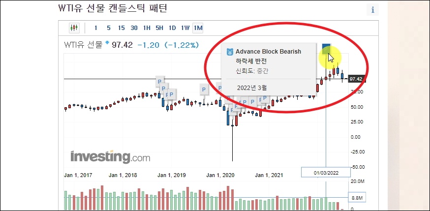 ▼다음은 앞으로 전망을 예측할 때 사용하는 도구 중 하나인 캔들스틱 패턴 입니다. 국제유가 중 하나인 WTI유 선물지수를 월봉으로 보았을 때 2022년 3월쯤에 하락세를 전망하고 있었네요. 무조건 맞는 것은 아니기 때문에 참고용으로 사용하면 좋습니다. 최근에는 이러한 캔들스틱 패턴을 많은 사람이 활용하기 때문에 반대로 가는 경우도 많아요. 이때에는 전략을 반대로 해석해서 사용하는 방법도 있습니다.