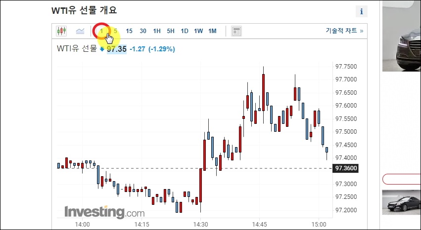 ▼먼저 실시간으로 움직이는 국제유가 선물 차트를 이용해 보겠습니다. 캔들 모양과 선 모양 이렇게 2가지 버전의 차트를 기본으로 제공하고 있는데요. 시간 단위를 1분으로 변경해 보세요. 그럼 매초마다 엄청난 변동을 보이는 국제유가 가격의 흐름을 확인할 수 있습니다. 개인적으로 짧은 기간 동안의 움직임은 가짜가 많기 때문에 흐름을 파악할 때에는 주봉이나 월봉으로 보는 것을 선호합니다.