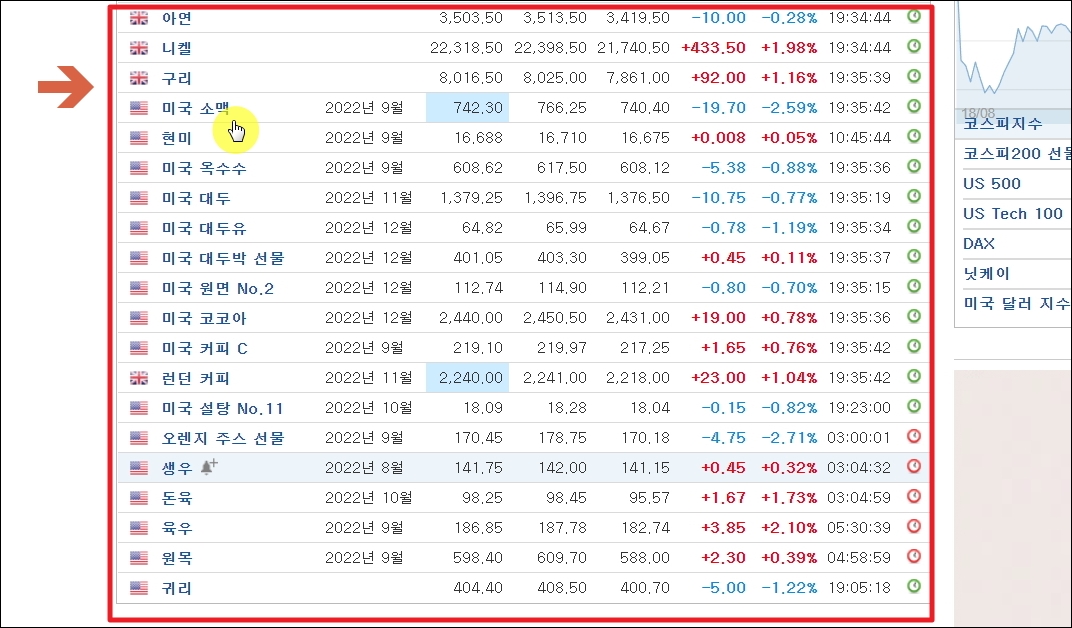 ▼앞서 살펴본 국제 원자재 동향을 실시간으로 살펴볼 수 있는 표가 나타났습니다. 이전에 언급한 것 외에 국제 식량 가격에 큰 영향을 주는 소맥, 현미, 옥수수, 대두, 대두유, 코코아, 커피, 설탕, 오렌지 주스 등의 상품에 대한 가격표가 보이네요. 개별 상품에 대한 가격동향을 파악하기 위해서는 차트를 이용하는 것이 좋은데요. 차트를 보려면 상품 이름을 마우스로 클릭하면 됩니다.