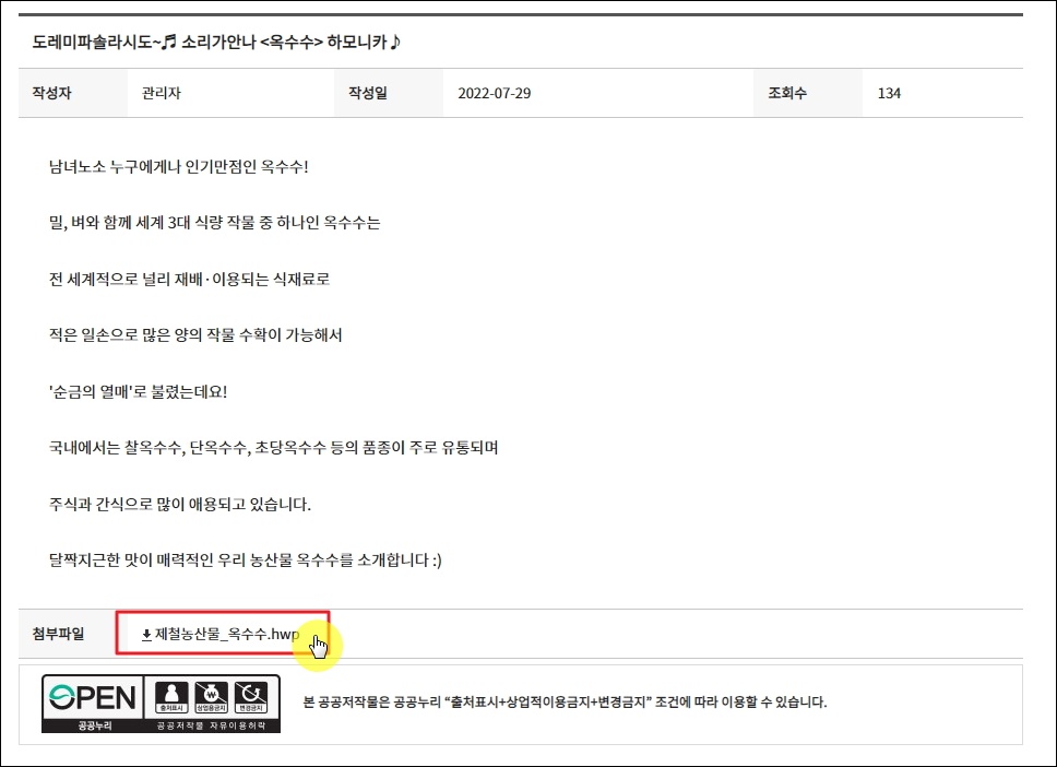 ▼저는 제철농산물 중 하나인 옥수수를 선택했습니다. 현재 옥수수는 밀과 벼와 함께 세계 3대 식량 작물에 속할 정도로 중요시 되고 있는데요. 게시물을 열면 첨부된 파일을 찾을 수 있습니다. 파일을 다운 받아 열어주세요.