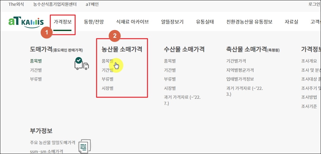 ▼사이트에 접속하면 메뉴에서 [가격 정보]를 클릭해 보세요. 도매가격에서부터 농산물, 수산물, 축산물에 대한 소매가격 확인이 가능합니다. 품목별, 기간별, 부류별, 시장별로 구분하여 시세조회를 할 수 있게 되어 있습니다.