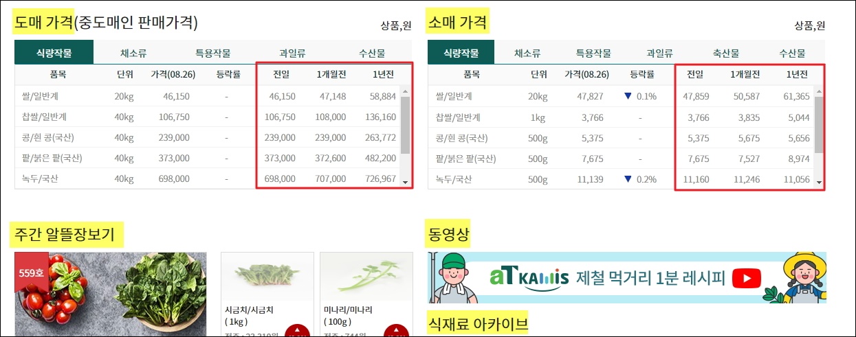 ▼다음과 같이 대표적인 실략작물이라고 할 수 있는 쌀, 찹쌀, 콩, 팥, 녹두 등에 대하여 현재 시세를 쉽게 파악할 수 있습니다. 표를 통해 전일, 1개월전, 1년전과 비교도 쉽게 할 수 있기 때문에 가격이 어떻게 변동 되었는지도 알 수 있습니다. 도매와 소매 가격 모두 볼 수도 있죠. 여기에 더하여 주간 알뜰장보기나 식재료 아카이드, 관련 동영상을 통해 농산물 이용에 관한 다양한 도움을 받을 수 있습니다.