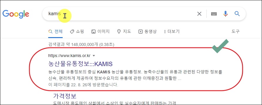 ▼방금 확인해 본 농산물 시세조회 방법을 어떻게 진행하는지 바로 알려드리겠습니다. KAMIS 사이트에 접속하면 되는데요. 이곳에서는 수산물, 축산물에 대한 시세 확인도 가능합니다.