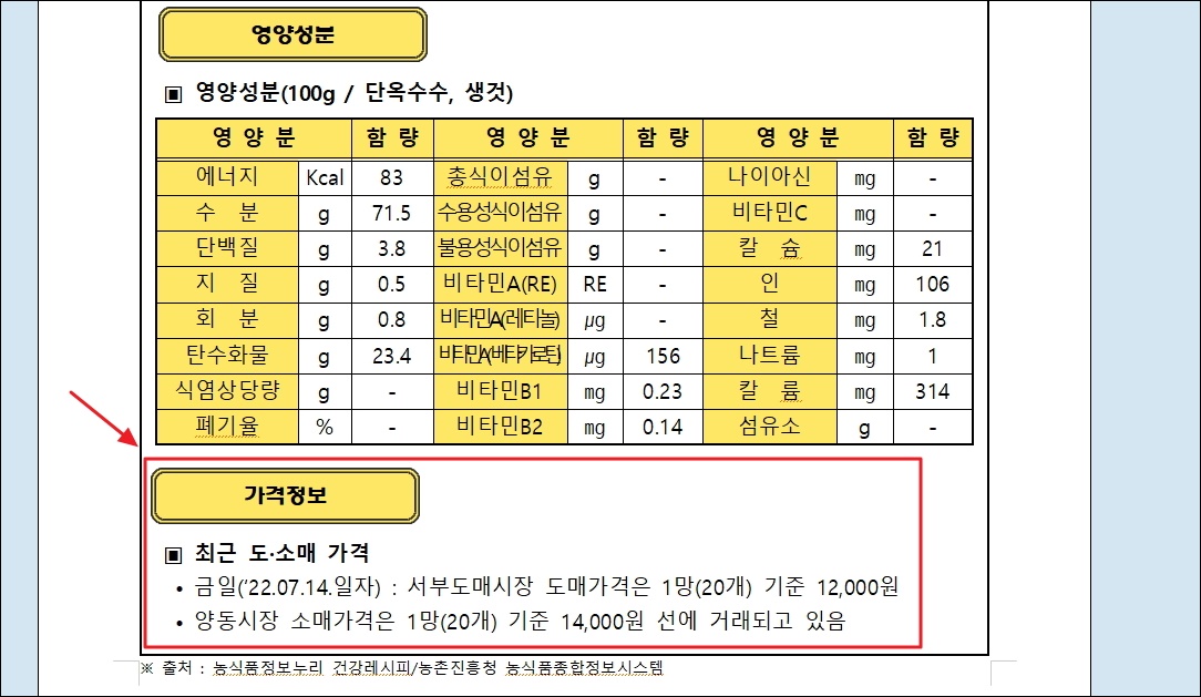 ▼파일을 열어보면 제철 시기에 해당하는 농산물에 대하여 많은 정보를 많이 얻을 수 있습니다. 이 중에는 옥수수에 대한 가격 정보도 확인이 가능한데요. 제철인 시기에 도매 및 소매 가격이 어떻게 되는지 조회를 하고 싶을 때 이용하면 좋습니다.
