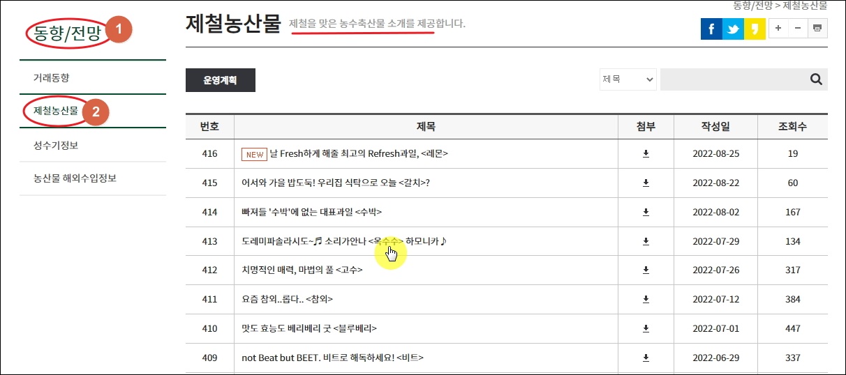 ▼신선하고, 저렴한 농수축산물에 대해 알고 싶다면 메뉴에서 [동향 / 전망]을 클릭한 후 [제철농산물] 메뉴를 선택해 주세요. 여기에서는 레몬, 수박, 옥수수, 고수, 참외, 블루베리, 비트 등 다양한 농산물에 대한 정보를 조회할 수 있습니다. 원하는 정보의 게시물을 클릭해 보세요.