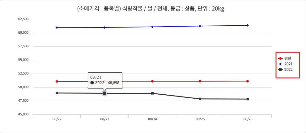 ▼표를 이용하는 것보다 그래프로 보는 것이 시세를 파악하는 데에 도움이 될 수 있습니다. 평년, 2021년, 2022년에서 같은 날짜에 시세가 어떤 흐름을 보였는지 그래프를 통해 쉽게 살펴볼 수 있습니다.