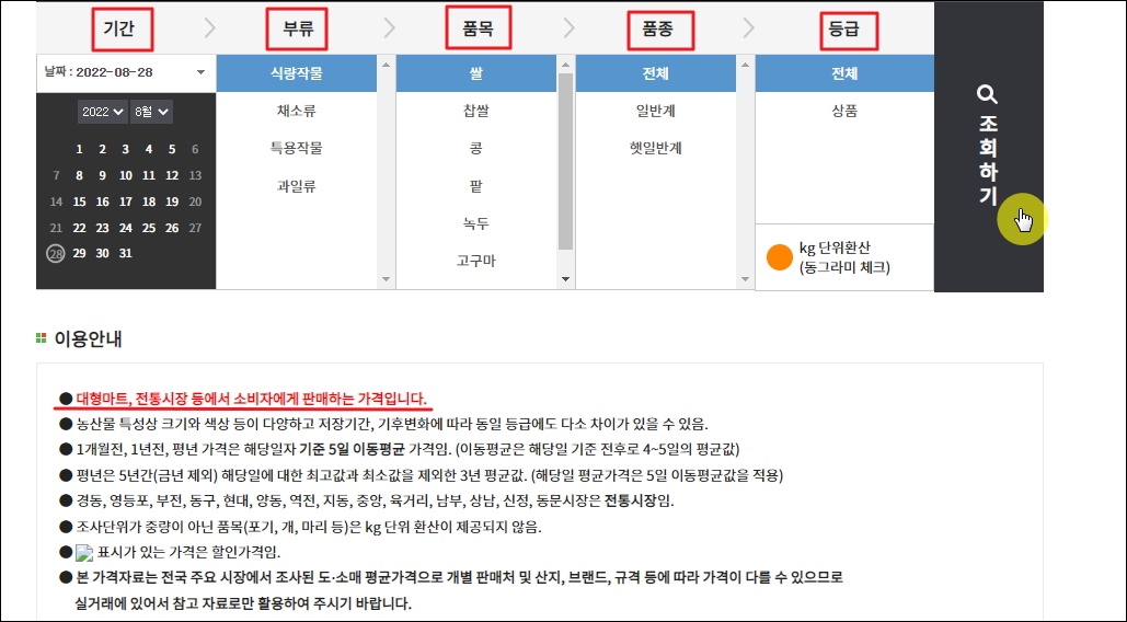 간편하게 도매 및 소매 농산물 시세조회 진행하기.