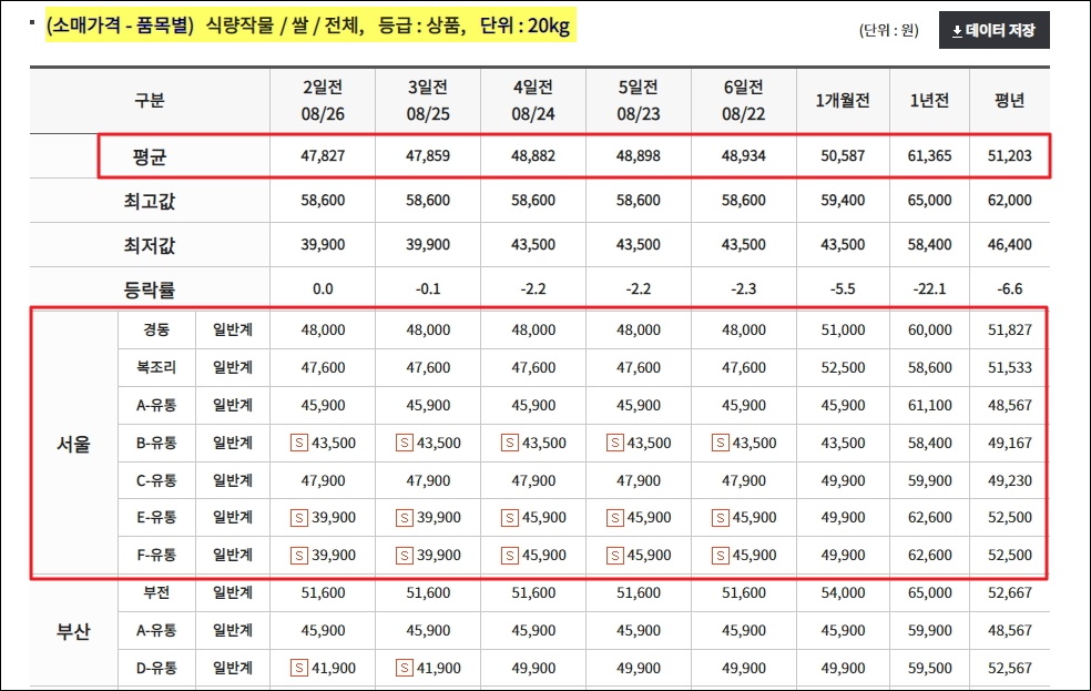 ▼저는 국내에서 가장 대표적인 농산물에 해당하는 쌀을 검색해 보았습니다. 20kg 기준으로 작년보다 오히려 하락했네요. 물가가 매년 상승하는 것처럼 보이지만, 시세조회 결과를 보면 다음과 같은 일부 농산물의 경우에는 이전보다 가격이 하락하는 일도 발생합니다.