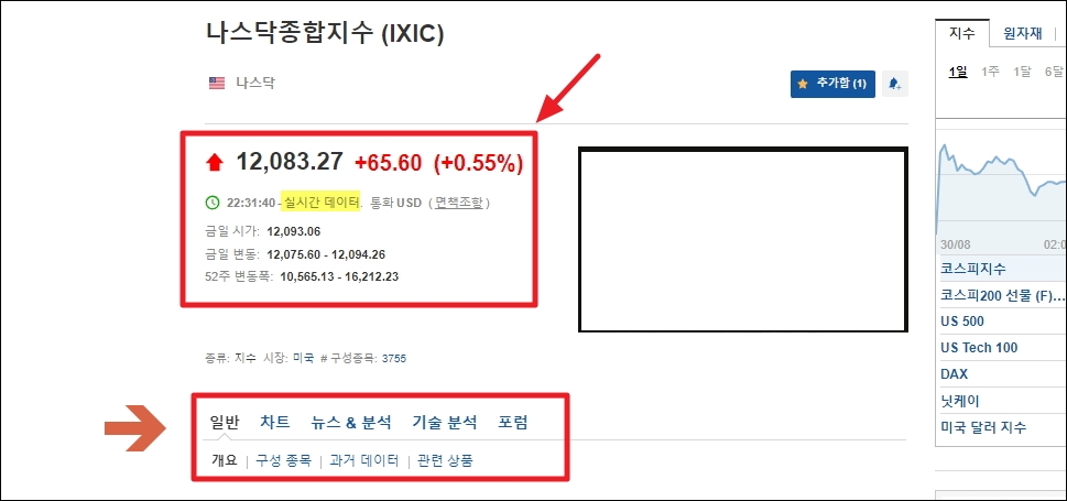 ▼이전 단계에서 본 표에서 나스닥 종합지수를 클릭해 보았습니다. 세계 주식시장의 흐름을 파악하는 데에 주요한 지표 중 하나인데요. 현재 가격 부분을 보면 "실시간 데이터"라고 표기가 되어 있습니다. 실제 데이터를 온라인 사이트에서 실시간으로 반영하고 있다는 의미죠. 바로 아래에는 여러 가지 관련 서비스를 선택할 수 있는 메뉴가 있습니다. 주요한 몇 가지를 살펴보겠습니다.