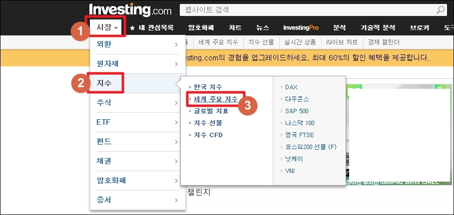 ▼인베스팅 사이트에 접속했습니다. 메뉴에서 [시장], [지수], [세계 주요 지수]를 차례대로 클릭해 주세요.
